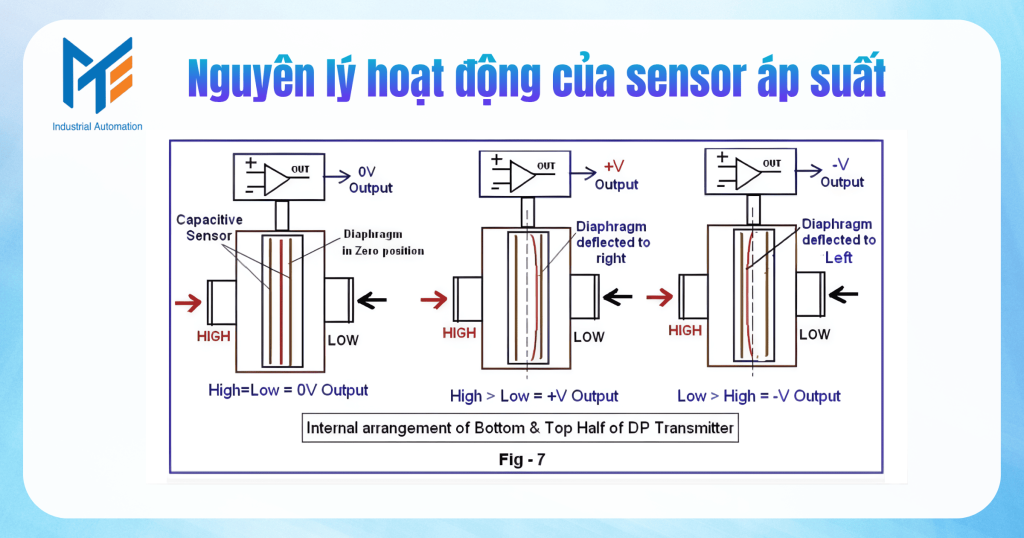 Theo như hình trên, giả sử khi áp suất dương (+) đưa vào thì lớp màng sẽ căng lên từ trái sang phải, còn khi đưa vào áp suất âm (-) thì lớp màng sẽ căng ngược lại. Chính nhờ sự thay đổi này tín hiệu sẽ được xử lý và đưa ra tín hiệu để biết áp suất là bao nhiêu.