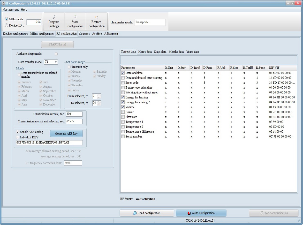 - Cửa sổ chương trình RF configuration hiển thị cấu hình giao diện RF của đồng hồ và danh sách dữ liệu truyền qua RF.