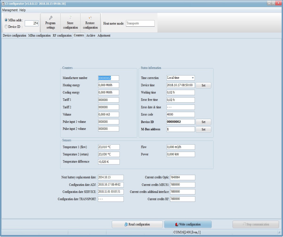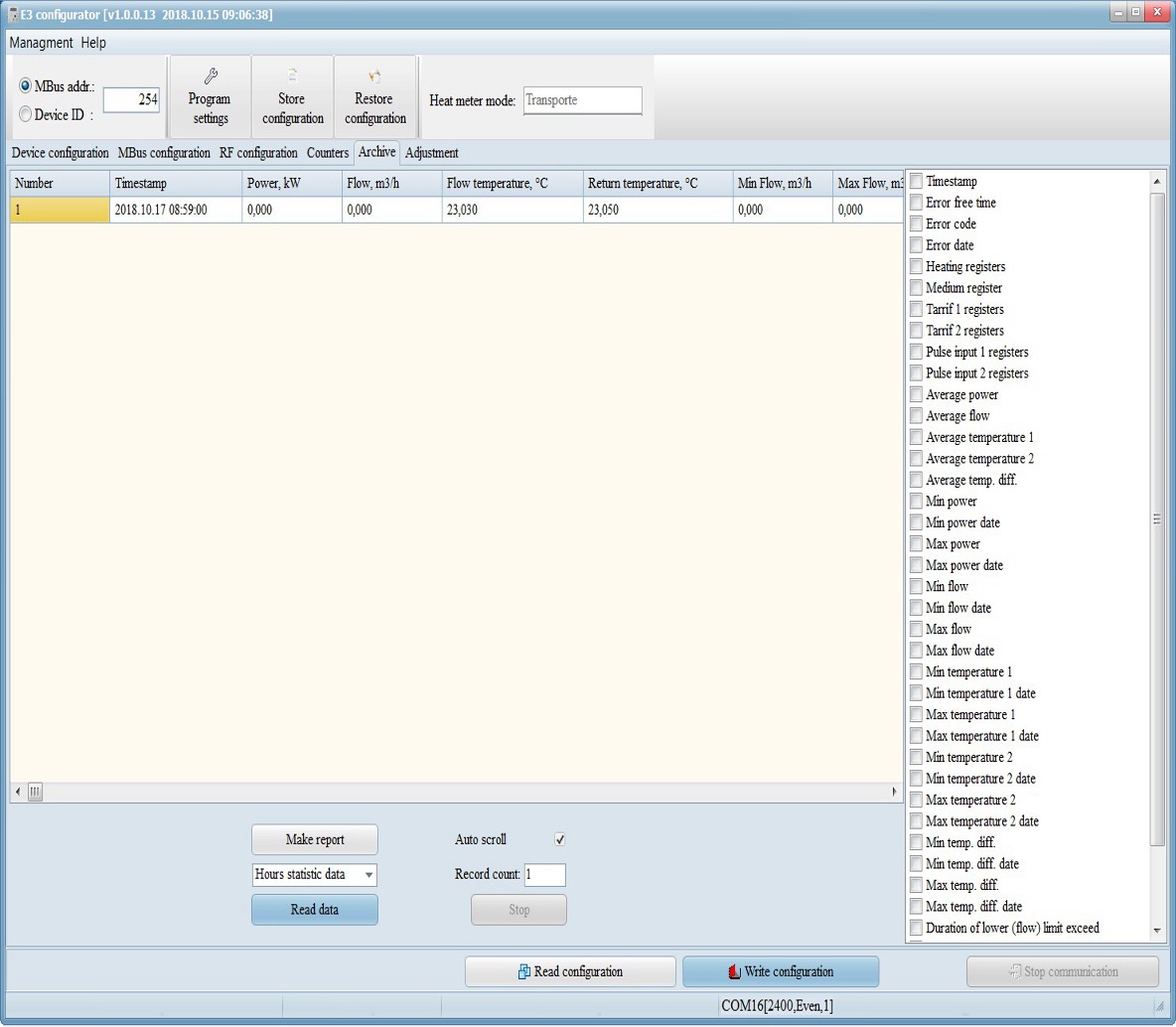 Ví dụ: Heatmeter mode: Mode not read !!! - Cửa sổ chương trình Device configuration hiển thị cấu hình đồng hồ đã đọc.
