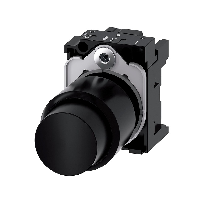 Pushbutton, compact, with extended stroke (12 mm), 22 mm, round, plastic, black, pushbutton, raised, momentary contact type, with holder