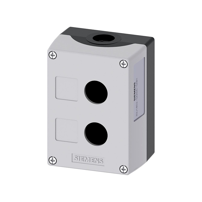enclosure for command devices, 22 mm, round, enclosure material plastic, enclosure top part gray, 2 control points plastic, B=Pushbutton green, label: Up, 1 NO, screw terminal, A=Pushbutton black, label: Down, 1 NO, screw terminal, floor mounting, 1xM20 each on top and bottom, Labels glued in