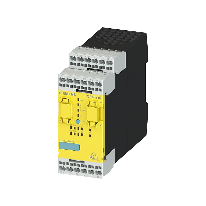 SIRIUS, Central unit 3RK3 ASIsafe Basic for modular Safety system 3RK3 1/2F-DI, 6DI, 1F-RO, 1F-DO,24 V DC Monitoring of ASI slaves Control of 8 safe outputs on AS-Interface bus parameterizable using software Safety ES 45 mm overall width Spring-type terminal Up to SIL3 (IEC 61508) Up to Performance Level E (ISO 13849-1) No extension module connectable
