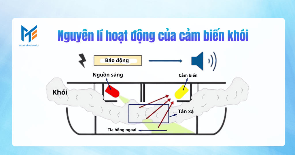 - Nguyên lý hoạt động: Cảm biến chứa một nguồn sáng (thường là đèn LED hồng ngoại) và một cảm biến quang (photodiode) đặt lệch góc nhau (thường là 90 độ) trong một buồng tối. Ở điều kiện bình thường, chùm sáng từ LED chiếu thẳng và không đi tới cảm biến quang. Khi các hạt khói (thường là các hạt lớn, nhìn thấy được, sinh ra từ các đám cháy âm ỉ) đi vào buồng, chúng sẽ làm tán xạ chùm sáng (hiện tượng Tyndall). Một phần ánh sáng bị tán xạ này sẽ đi chệch hướng và chiếu trúng vào cảm biến quang. Khi lượng ánh sáng nhận được đạt đến một ngưỡng nhất định, mạch điện tử sẽ kích hoạt báo động.