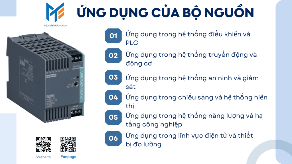 - Bộ nguồn công nghiệp (đặc biệt là nguồn Siemens và Mitsubishi) thường được sử dụng để cấp nguồn 24VDC cho PLC, cảm biến, rơ-le và các module điều khiển.