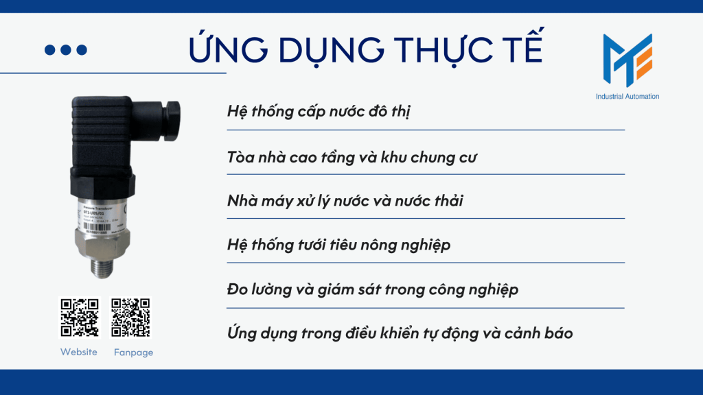 Ví dụ: Hệ thống nước của một tòa nhà 15 tầng tại Đà Nẵng sử dụng cảm biến áp suất nước tĩnh loại thả chìm để giám sát mực nước bể ngầm. Khi mực nước thấp hơn 1,5 m, bơm tự động khởi động bơm bổ sung, giúp duy trì áp lực ổn định cho toàn bộ hệ thống phân phối.